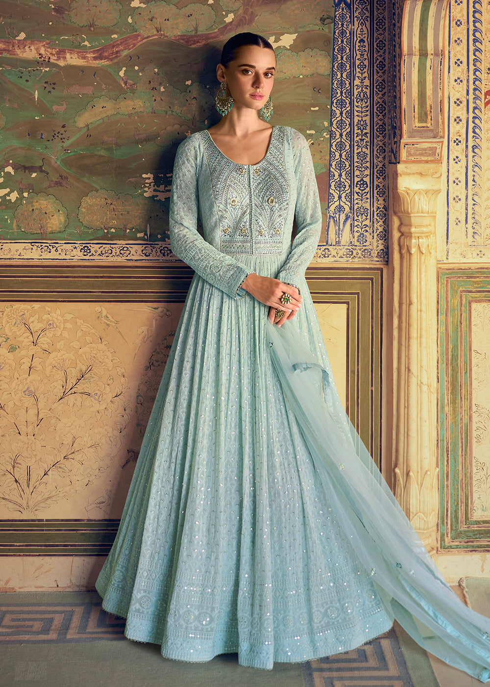 Sky Blue Thread Embroidered Anarkali Salwar Suit