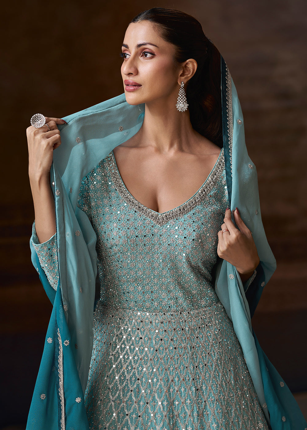 Sky Blue colored straight cut style kameez in chinon with heavy Zari & sequin embroidery and mirror work all over. Comes with matching colored bottom and dupatta. The semi-stitched kameez can be customised upto 42 inches. Do Note: All the accessories shown are for styling purposes only. Slight color variation may occur due to photographic reasons.