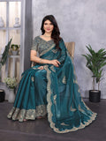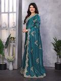Teal Blue designer chiffon saree crafted in zari sequin embroidery work all over. Comes along with a matching color blouse in similar work . The un-stitched saree blouse may be customized up to 44 inches.
