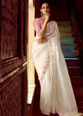 White silk saree crafted in heavy embroidered sequin and moti work all over. Comes along with a pink color silk blouse in similar work . The un-stitched saree blouse may be customized up to 44 inches.