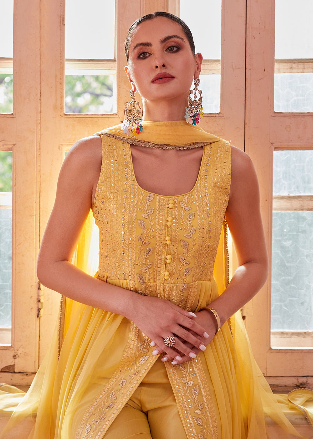 Yellow colored anarkali style front slit kameez in georgette with heavy thread and zari embroidery and sequin work all over. Comes with matching colored shantoon bottom and net dupatta. The semi-stitched kameez can be customised upto 42 inches. Do Note: All the accessories shown are for styling purposes only. Slight color variation may occur due to photographic reasons.