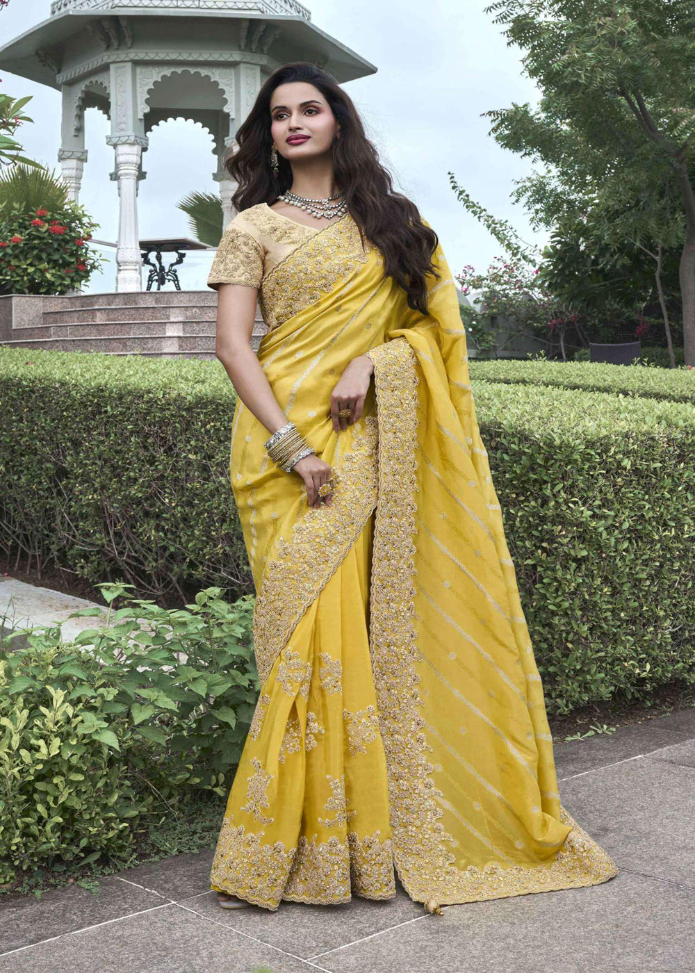 Yellow tissue silk saree crafted in heavy zari embroidery mirror & Stone work all over. Comes along with a beige color silk blouse in similar work . The un-stitched saree blouse may be customized up to 44 inches.