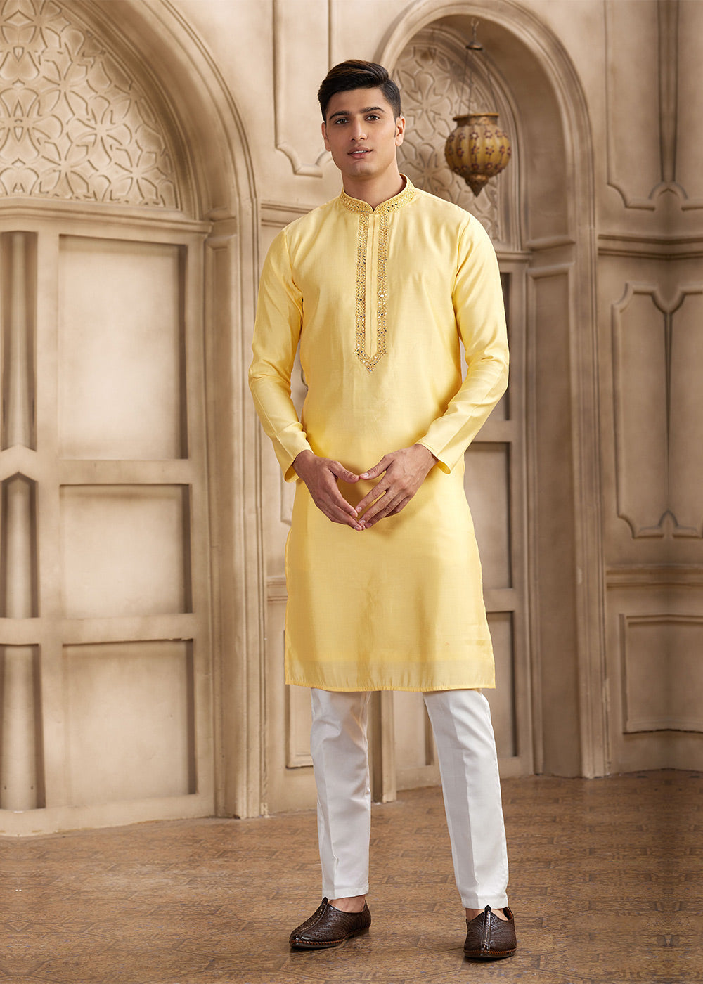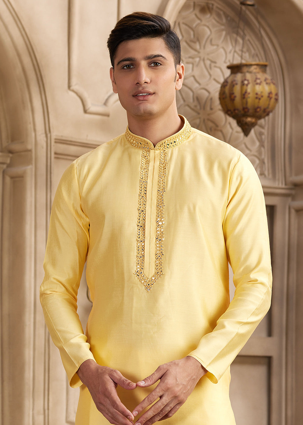 Yellow Mirror Embroidered Kurta Pyjama For Men