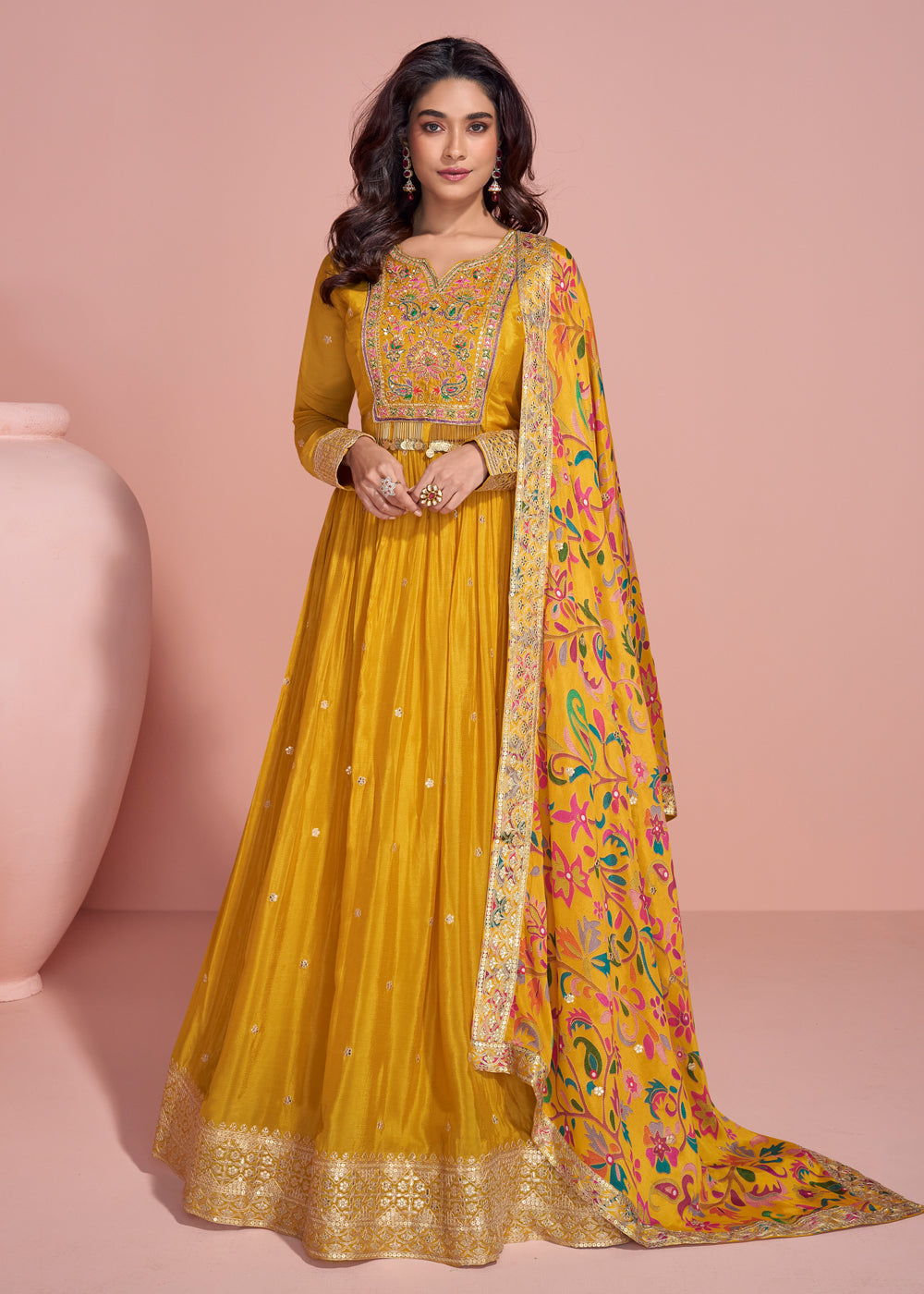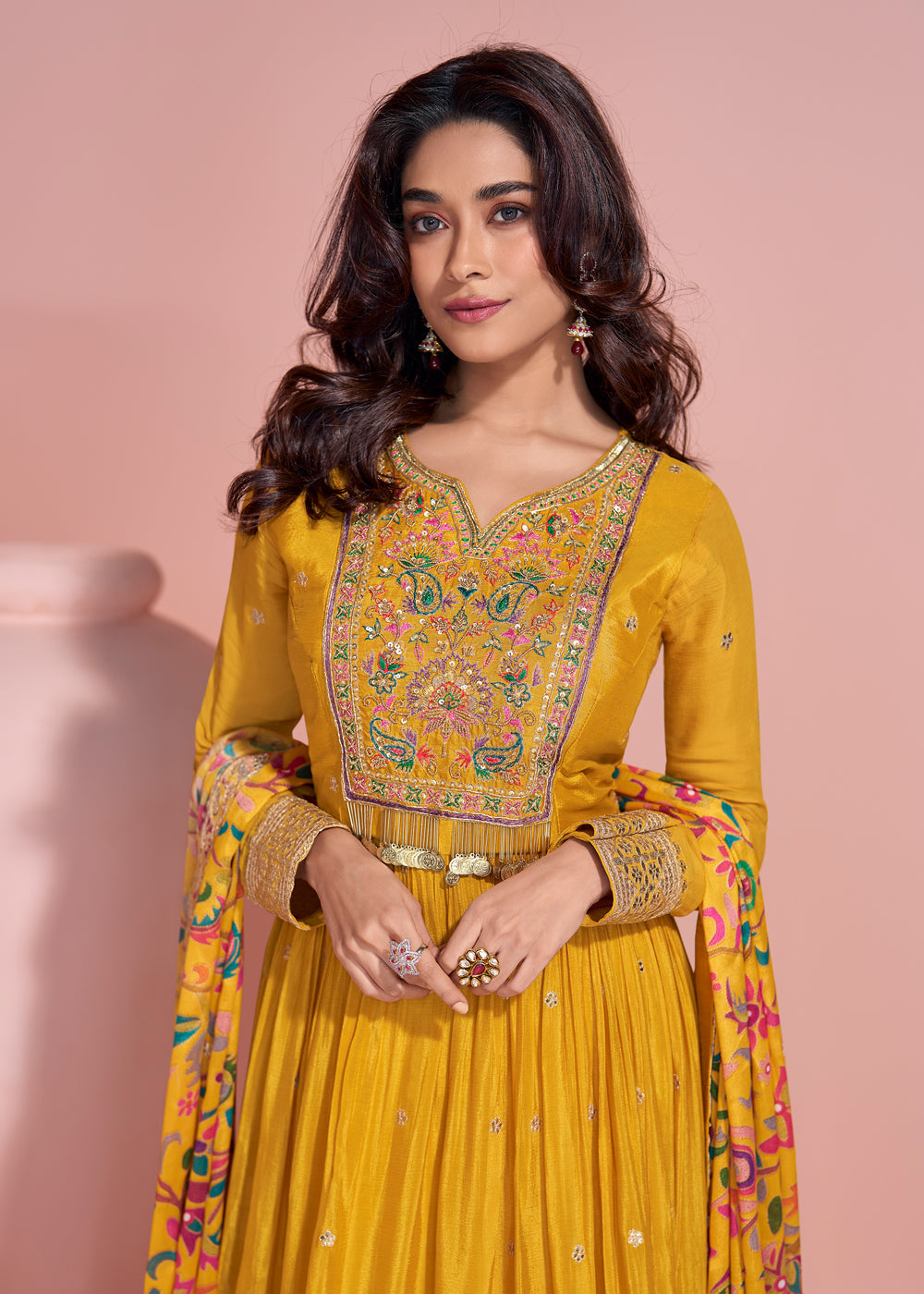 Yellow Thread Embroidered Anarkali Suit In Silk